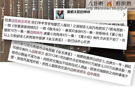 內地中介人鄭婷婷近日在微博炮轟苑瓊丹拒付傭金,按她所指,早前鄭婷婷為胡杏兒、苑瓊丹傾好接拍新劇《金玉滿堂》,胡杏兒收二百三十萬人民幣做女主角,苑仔則收五十三萬做配角,兩人承諾分別付她傭金一至一成半,但事後卻沒有兌現。鄭婷婷表示自前年底開始為苑瓊丹接戲,而胡杏兒則是經苑仔介紹認識。據知,當時劇組原本開價五十萬給苑瓊丹,但她不滿意,幾經爭取才加碼三萬。