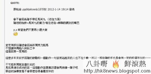 結果昨天馬總統勝選,粉絲在官方後援會直說一直揪心緊張著這件事,留言「還好沒有輸 不然那些迷信+無聊的網友又會怪祥拍背」,更說「會不會因為豬手帶旺馬英九 (迷信方面),豬迷的加持+馬英九的實力 堵住迷信+無聊的網友的嘴巴」十足力挺偶像,更希望不要再小題大作。