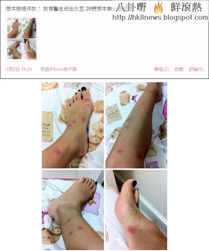 日前蕭若元更向傳媒爆料指片中女主角「撲性女」是今年二十三歲o靚模朱韻蓓(Tess),朱韻蓓曾當龍友模特兒,現於香港寬頻優質生活台擔任主持。成為疑似「撲性女」,朱韻蓓即於微博上大平反,她上載了一張雙腳布滿紅印的相片,並留言話:「根本就唔係我! 我有醫生紙出水痘26號根本無出過街……」哦!原來係咁!