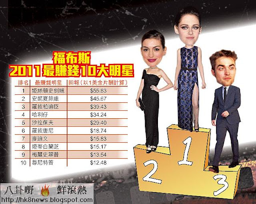 講完「敗家仔」、「敗家女」, 當然要講下邊個明星最生性。福布斯早兩日公布「2011最賺錢明星」, 第一位姫絲頓史釗域(Kristen Stewart)。佢憑《吸血新世紀》而成名,整個系列累計票房高達24億美金, 成績驕人。佢男友羅拔柏迪臣(Robert Pattinson)雖然有份主演《吸血》系列, 但前作《驚動了愛情》、《情約奇藝坊》票房普通, 間接拖低回報率, 排名只得第三。至於第二位, 由安妮夏菲維(Anne Hathaway)奪得。佢主演嘅《愛麗絲夢遊仙境》票房狂收10億, 《新娘愛鬥大》、《愛情戀上癮》均成績唔錯, 下一年《蝙蝠俠3》上埋映的話, 有望打敗姬絲頓,成為2012嘅吸金女王。 ####