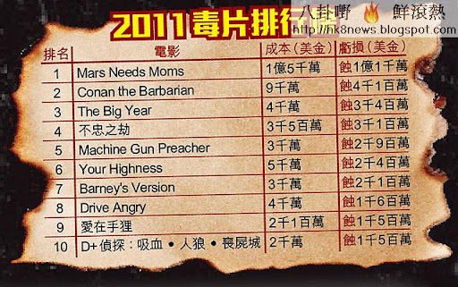 2011年話咁快就完,係時候埋單計數。今年市道普通,連帶電影票房都表現一般。做老闆嘅無他嘅,唔望你賺都唔想你蝕。偏偏事與願違。諗住請得鬱妮歌潔曼、尼古拉斯基治呢類A級明星,應該好有號召力。點知觀眾一句唔buy,票房咁就跌落穀底。除咗令老闆蝕錢,最無奈仲要孭住「票房毒藥」呢個稱號。2011毒後毒王,我哋有請。