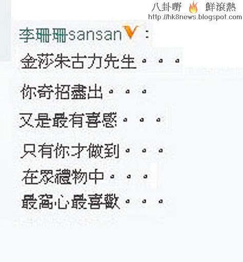 李珊珊當年狠撇錢嘉樂,之後堅決表示沒有復合機會, 剖白會當他如家人般永遠愛錫和支持。之不過「樂盈戀」好事近,李珊珊近日卻突然在微博高調曬新戀情。