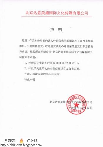 葉世榮所屬的經理人公司-北京達意美施文化傳媒,沒有對新娘子是張偉鈴作出證實,只在微博向媒體及外界表示感謝,強調為了尊重藝人與家屬意見,婚禮不向外公開,婚禮的信息與圖片,會在婚宴後發放。