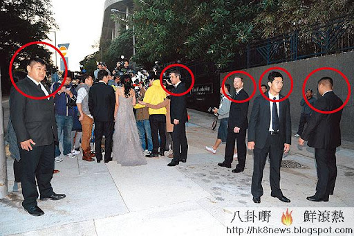 由James Bryce領軍,仲有四位同事望住唔同方向保護一對新人,但偏偏睇漏記者一眼,莫文蔚差啲被咪牌撲中頭。