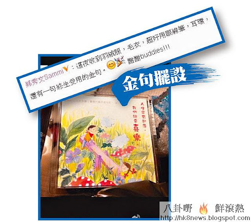 Sammi除咗有安仔送禮物,仲有一班忠實fans,今年佢收到好多禮物,有實用嘅羽絨褸、冷衫同埋化妝品,不過佢最鍾意嘅一樣竟然係金句擺設,信主得救嘅Sammi,都係着重心靈滿足。