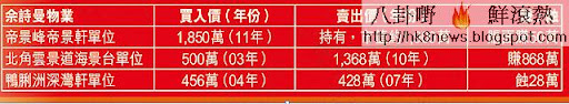 賺錢能力高的阿佘,一向喜歡投資物業,而且眼光獨到。03年,她以500萬購入海景台單位,去年趁高位賣出,激賺868萬。至於鄭嘉穎,03年買入蔚藍灣畔單位,07年已售出套現,之後由西貢村屋搬到紅磡海韻軒服務式住宅,大屋換細屋,加上08年金融海嘯,鄭嘉穎因投資股票慘蝕二百萬,身家同女友差一大截。