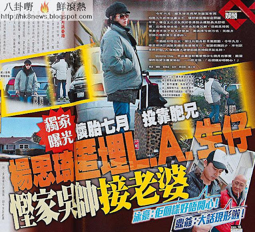 事實上,原本一直與母親居於將軍澳清水灣半島的楊思琦,自9月起就一直「潛水」,直至近日她才被發現潛藏美國,寄居在其胞兄位於L.A.約千三呎的平房待產。思琦雖然穿上厚厚羽絨褸,仍遮掩不到其懷胎7個多月的身形。而當時吳帥亦在旁照顧女友,陪她度過聖誕佳節。