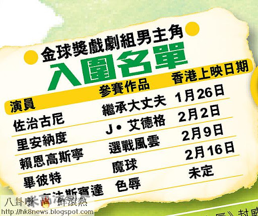上周四(15日)金球獎公布入圍名單,里安納度有份角逐戲劇組「最佳男主角」。如果靚仔有着數,里安肯定有優勢。問題係候選靚仔唔止佢一個,畢彼特亦係其中之一。不得不提嘅,仲有佐治古尼,今勻佢憑《繼承大丈夫》角逐影帝,但佢執導嘅《選戰風雲》口碑不俗,除獲提名「最佳戲劇組電影」、「最佳導演」,更帶挈另一男主角賴恩高斯寧入圍「最佳男主角」。里安想再稱帝,確係唔容易。 ####