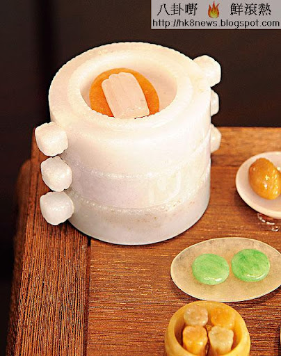小時候我們玩煮飯仔,用的都是膠或瓷造的杯碟、食物,原來鄺美雲都有這種玩家家酒的情意結,今日再玩這些玩意,「道具」都是由珍貴的翡翠所造,一枱迷你玉製點心,動輒半百萬,仲要唔係有錢就買到,鄺美雲笑笑口說:「我用嘅全部係天然玉嘅顏色,冇染色,所以要慢慢儲到啱用嘅玉,再搵師傅雕刻。」問她這些擺設會否割愛?她笑住說:「我間鋪咁多嘢賣,揀第二啲嘢買啦!」