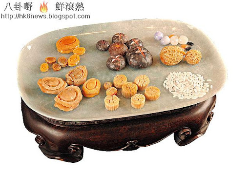 食物拼盤無論黑玉冬菇、白玉米粒、黃玉元貝和鮑魚等,都雕得極為神似,而擺放這些玉海味的翡翠白玉盤,是Cally高價從行家處收來。