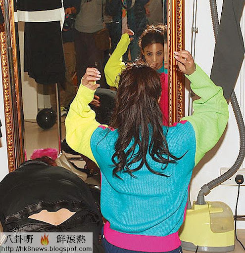 騎呢襲港上周六(17日)張馨予在影樓拍寫真。面對近廿名記者,她收起性感,穿着一件衞衣應酬。她在鏡子前裝扮好後,突然擺出勝利手勢,非常奇怪。