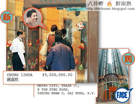 日捱夜捱,鍾嘉欣為嘅都係投資物業穩打穩紮。嘉欣自06年已經以近2百萬購入將軍澳新都城1個6百多呎細單位,今年1月再豪擲5百多萬於同屋苑購入另一個1千呎嘅單位,孭2層樓,加埋月供4至5萬,唔搏唔得。鍾嘉欣解釋︰「之前嗰間1個人住夠嘅,但如果父母來港就唔夠喇,早排去睇樓,覺得價錢合理,舊居又可以出租,咪決定買囉。(新居已升值百多萬?)升咗少少啦,我比較穩陣,唔識投資、又唔識買酒莊,主要係買磚頭,女仔應該有層樓嘅。」同嫁有錢佬豪買半億酒莊嘅趙薇比,靠自己嘅鍾嘉欣真係視圈清泉呀!