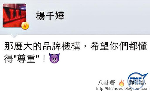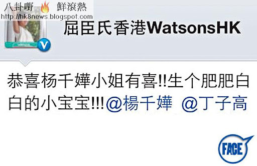 廣告商係米飯班主,但烈女千嬅一樣敢言冇面畀。事緣上週四(8日),屈臣氏官方在公司微博上公開恭喜千嬅有喜嘅消息,搞到因為「怕小器」,從未公開承認有B嘅千嬅,不惜得罪米飯班主,喺微博上發火回應,叫有關方面要「懂得尊重」,不過雙方言論都隨即被刪除。本刊至截稿前,屈臣氏公關仍未回覆。 ####