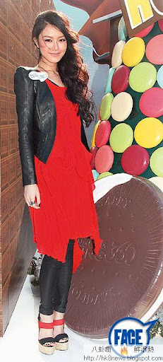 紅色前短後長連身裙,下襯黑色leggings和皮褸,簡潔有魅力。再悉心配對紅黑搭帶厚底鞋,有心思。不過裙身再短幾吋,仲好睇。
