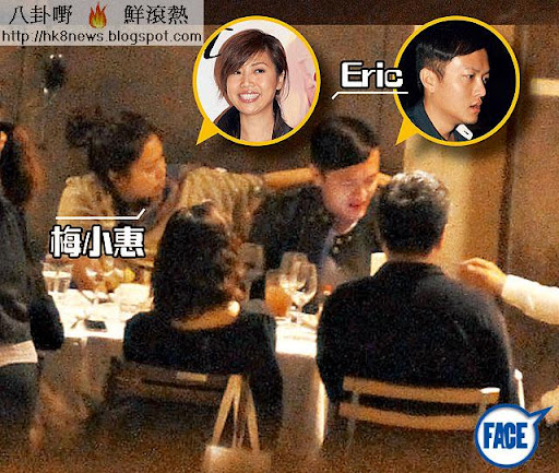 前週三晚(7日)FBI行經中環歌賦街,發現Eric同梅小惠仲有幾位朋友食緊西餐,其間梅小惠不斷哄埋Eric身邊,又幫佢按摩鬼咁好服侍。一行人食完西餐再行過對面馬路食埋牛腩麵先散band,就喺呢個時候,梅小惠竟然撲埋Eric度繑實對方。不過FBI八到佢兩個只係老友,所以梅小惠一定唔係「小三」囉。 ####