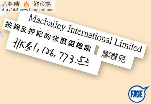 喜歡買物業投資的廖碧兒,04年以233萬購入新都城寓所現已供完,而07年父親廖永怡購入550萬的灣仔尚翹峰單位仍在供款。但本刊查詢記錄,發現廖碧兒和一名叫「廖永揚」的人註冊的Macbailey International Limited公司,現時欠債達112萬。