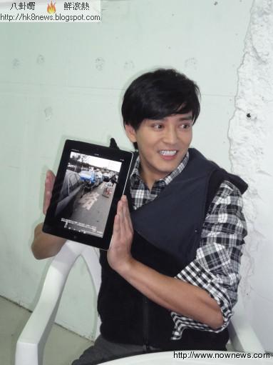 陳曉東28日上午來台彩排前,在上海發生車禍,他拿著平板電腦說明事發經過,表示自己沒受甚麼傷。(記者許世穎/攝影)